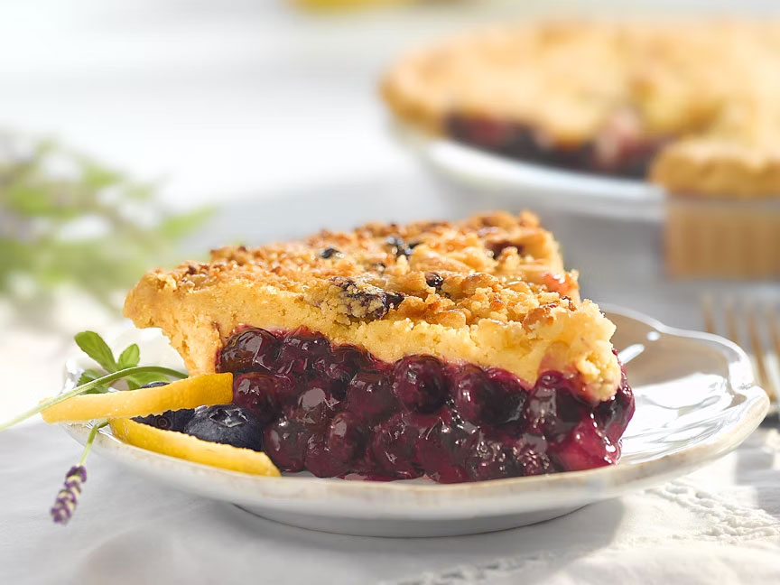 Our blueberry lemon buckle pie is filled with large, juicy blueberries topped with sugary, lemon crumb topping,