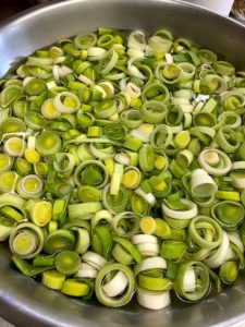 Leeks are in the allium family related to onions, garlic, chives, shallots, ramps and scallions. One taste and you will be able to tell that very easily. Leeks have a sweet, milder onion flavor that works so well as a base for soups, stews, pasta dishes. It’s a long bulbous vegetable with white flesh and leafy green tops and most people may be familiar with using the white parts only. We believe in using every part of the leek and suggest saving the dark green leaves for making homemade stock. Leeks can also shine on their own and are adaptable to a variety of cooking techniques such as; roasting or grilling, sautéing or steaming, and may be fried or used raw in salads.