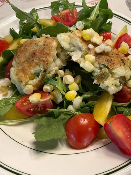 Leftover: Reheat a patty and serve over salad garnished with a little extra corn, chopped parsley, and a little chopped cooked bacon(optional).