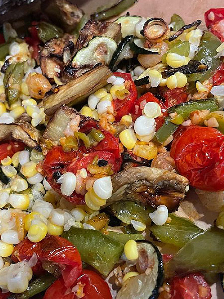 Return all the roasted vegetables to the pan adding the corn. Gently toss together. Roast an additional 5 minutes, just until all the vegetables are heated through. Serve hot or at room temperature.